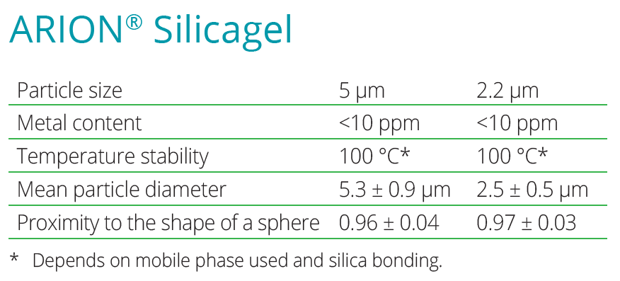 Podstawą kolumn ARION jest ultraczysta krzemionka o wysokiej jednorodności cząstek i wąskim rozkładzie ich wielkości. Dzięki temu możliwe jest uzyskanie stabilnych parametrów przepływu fazy ruchomej oraz wysokiej liczby półek teoretycznych, co bezpośrednio przekłada się na sprawność chromatograficzną.